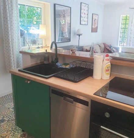 Często podczas remontu kuchni mamy pokusę dokonania w niej całkowitej rewolucji. Tymczasem zmian może wymagać tylko funkcjonalność i design zabudowy, a nie sam układ szafek oraz sprzętów. W tym przypadku kuchenny aneks oddzielony był od salonu murkiem, którego zadaniem było między innymi ukrycie ciągu roboczego. W murku były również instalacje wodno-kanalizacyjne. Szafki do przechowywania produktów i naczyń oraz lodówka umieszczone były na przeciwległej ścianie. Po długich debatach właściciele postanowili kupić całkowicie nowe wyposażenie, ale zostawić ten sam układ zabudowy. Pozostawienie murku pozwoliło uniknąć kosztownych zmian, związanych z przenoszeniem instalacji. Planując nową zabudowę, zrezygnowali jednak z szafek narożnych, kierując się przekonaniem, że proste ciągi zabudowy znacznie ułatwiają korzystanie z mebli. Dzięki precyzyjnemu rozplanowaniu wnętrz szafek poprawiła się także funkcjonalność kuchni. Dolne szafki zamykane drzwiczkami zastąpiono szufladami, które ułatwiają dostęp do produktów i naczyń. Liczbę szafek ograniczono do minimum – tutaj musi się zmieścić jedynie to, co niezbędne podczas kucharzenia na letnisku. Odzyskaną przestrzeń wykorzystano za to na większą lodówkę oraz zmywarkę. Dodatkowe miejsce do przechowywania i pracy zapewniają stoliki pomocnicze – barki na kółkach – jeden stanął między zabudową a lodówką, drugi pod oknem przy wejściu do aneksu. Spojrzenie na kuchnię z perspektywy saloniku przyciąga uwagę efektowną szmaragdową zabudową i turkusową lodówką w stylu retro. Będąc w środku aneksu, widzimy nowoczesną przestrzeń roboczą, a pracując przy niej mamy perspektywę na atrakcyjny pokój dzienny oraz zieleń ogrodu za jego oknami. Dawne położenie zabudowy nabrało nowego wymiaru. W takiej kuchni aż chce się gotować!